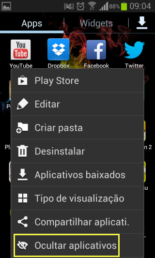 2. Depois de acessar os aplicativos, toque o botão de “Menu” do seu aparelho e selecione “Ocultar aplicativos”, como na imagem: