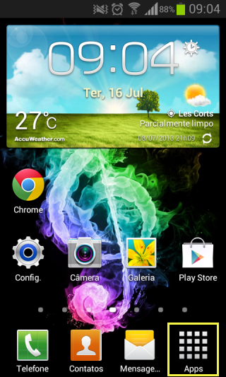 1. Procure o ícone “Apps” no seu celular: no nosso, ele está na tela inicial, no canto inferior direito. Entretanto, dependendo de qual versão do Android você usa, pode estar em outro lugar: