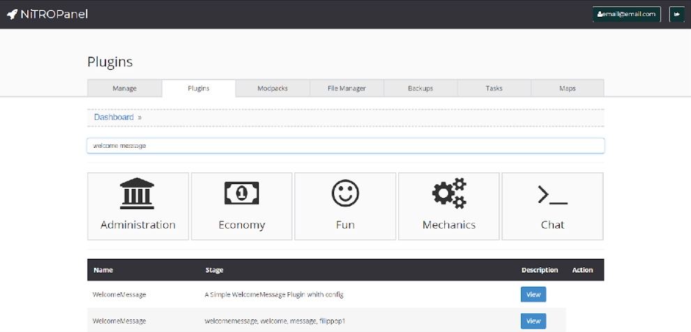 Com a maioria dos provedores de hospedagem de Minecraft renomados, instalar plugins é algo que pode ser feito via painel de controle. Navegue até “Plugins” e comece a ler sobre os diferentes tipos disponíveis. Nós iremos instalar um plugin que mostra uma mensagem aos jogadores que entrarem em seu servidor. Na barra de procura de “Plugins”, escreva “welcome message” e instale o seu primeiríssimo plugin.
