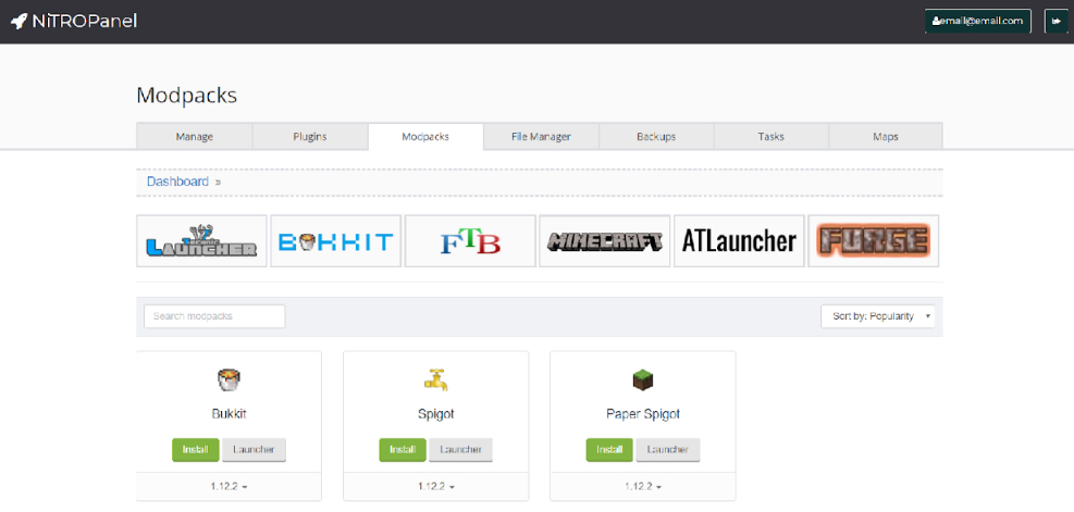 Não fique intimidado pelo jargão, instalar estes programas é muito simples. No painel de controle de seu servidor, vá até “Modpacks” e escolha entre Bukkit ou Spigot, então clique em Instalar. Pronto, é isso.