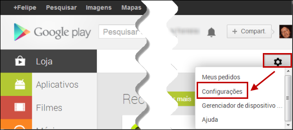 A primeira coisa a fazer é entrar na página do Google Play e fazer o login. Em seguida, clique no símbolo da engrenagem, no canto superior direito e escolha a opção “Configurações”: