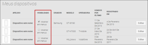 Na tela seguinte, serão exibidos todos os dispositivos da sua conta. Procure a coluna “Visibilidade” e desmarque as caixas correspondentes, onde está escrito “Mostrar em menus”: