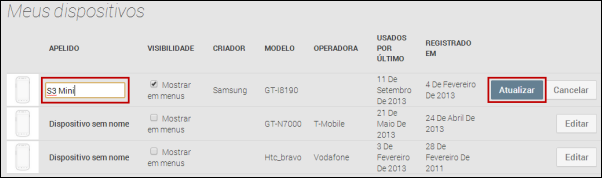 Note que, na mesma tela, na coluna da direita, existem os botões de “Editar”. Para mudar o nome de um dispositivo, clique no botão correspondente e escreva o que quiser no campo “Apelido”, exatamente como na imagem:
