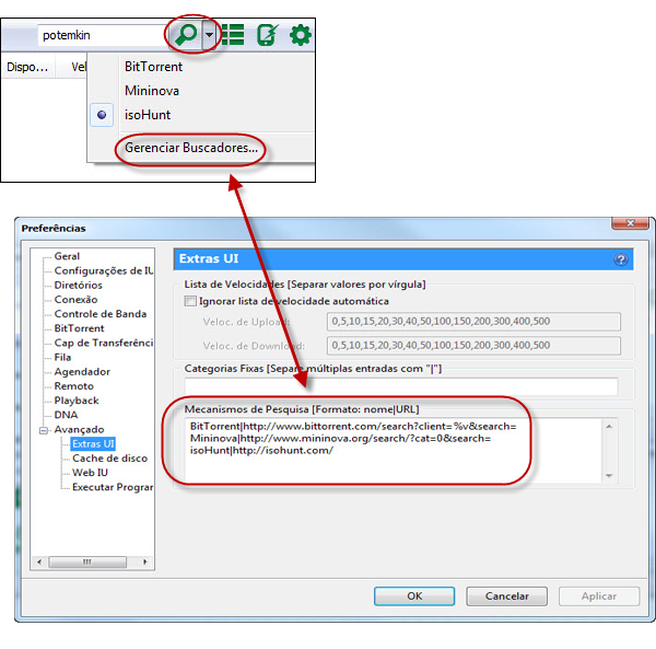 Para isso, clique na lupa ao lado do campo de pesquisa, vá a “Gerenciar buscadores” e, na janela “Extras UI”, inclua o site escolhido para pesquisas de torrents na caixa com o título “Mecanismos de Pesquisa” (use o formato nome|URL, exemplo: isoHunt|http://isohunt.com/).
