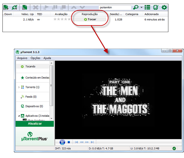 A nova versão do uTorrent vem com uma função que se chama “stream” ou “tocar”, com a qual você confere o material antes mesmo de o download chegar ao fim. Esse botão é bastante útil para conferir se o arquivo é mesmo o que você queria.