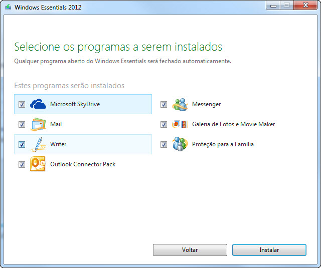 O arquivo de instalação do Windows Live Essentials 2012 abre uma janela na qual você pode escolher os programas que quer instalar. Se alguns aplicativos incluídos no pacote já estiverem instalados no seu computador, o Windows Live Essentials 2012 fará a atualização correspondente.