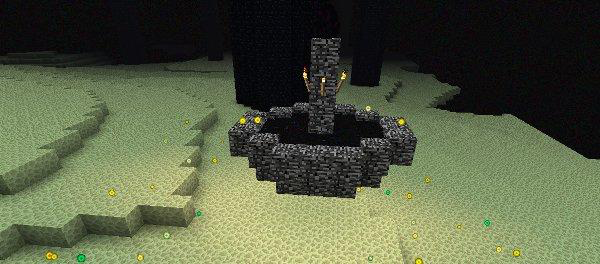 O Portal para o Fim é um quadrado 3×3 sem suas quinas, feito de blocos brancos com uma borda verde. Ele sempre está situado sobre algumas escadas com lava abaixo dela, e irá se parecer com este: