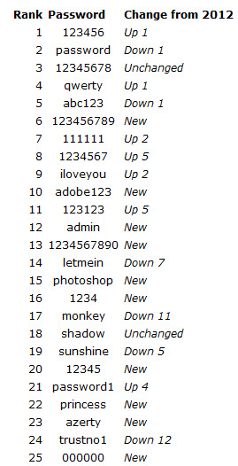 Como acontece todos os anos, o SplashData divulgou a lista das piores senhas de 2013. O vencedor do prêmio nada honroso é a sequência de números mais usada – e menos segura – do mundo: ‘123456’. A pequena série de pouca imaginação destrona o vencedor dos últimos anos, o redundante ‘password’, que cai para a segunda colocação.
