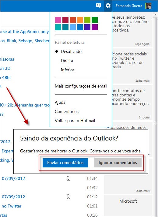 Você ainda pode ajudar a Microsoft enviando sua opinião sobre a nova interface do Outlook.com. Se não quiser fazer isso, basta clicar em “Ignorar comentários” e pronto!