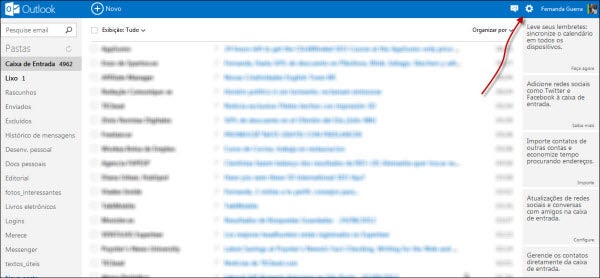 Entre no site Outlook.com normalmente, fazendo login com seu e-mail e senha. Em seguida, clique no ícone de engrenagem, no topo da página, do lado esquerdo do seu nome.